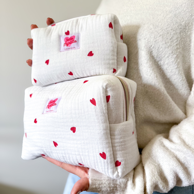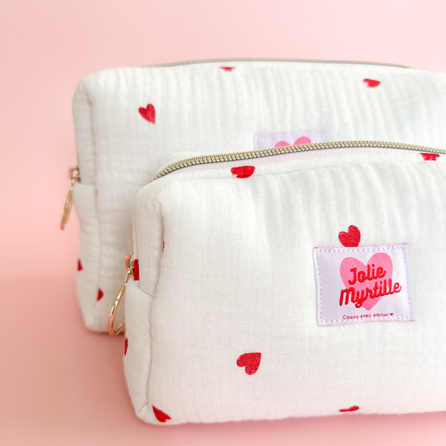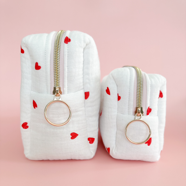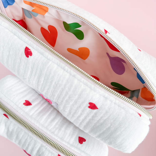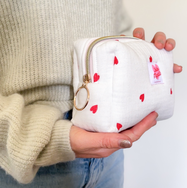 Albane, c'est la trousse beauté aussi belle dedans que dehors. En plus d'être toute douce en gaze de coton, elle cache un secret : sa doublure est imperméable ! Avec ses petits cœurs à l'extérieur comme à l'intérieur, c'est la trousse parfaite pour vos produits de beauté.