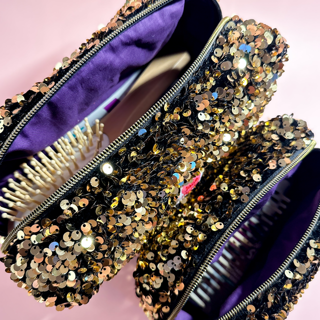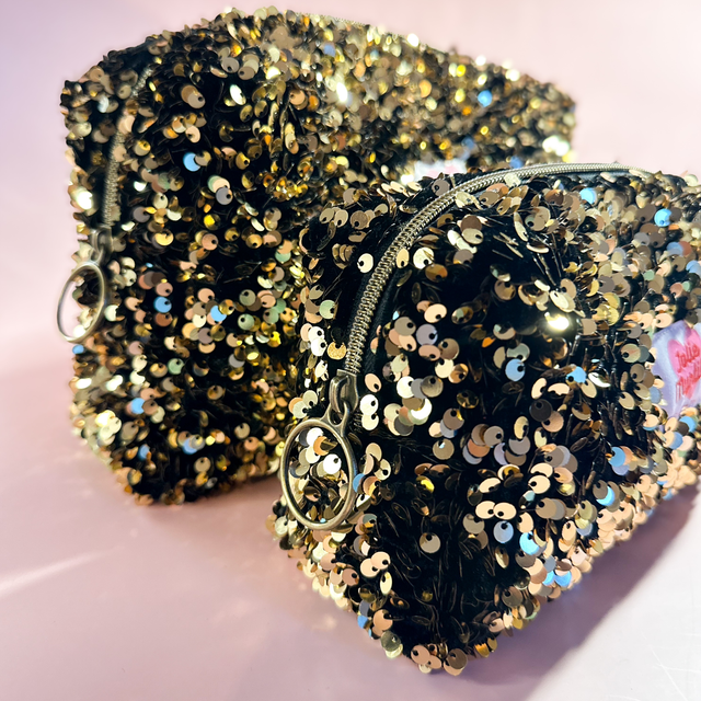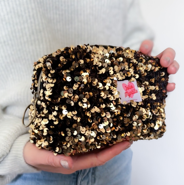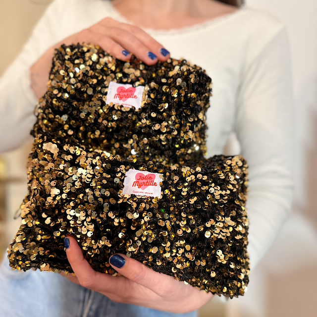 Iris, c'est la trousse qui ne passe pas inaperçue. Elle met littéralement des paillettes dans votre vie ! Son secret ? Une doublure en coton violet profond qui tranche avec son extérieur scintillant à sequin doré.