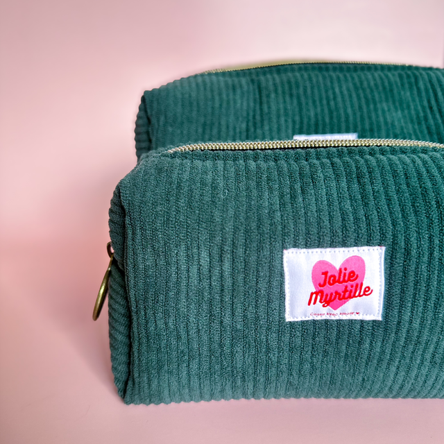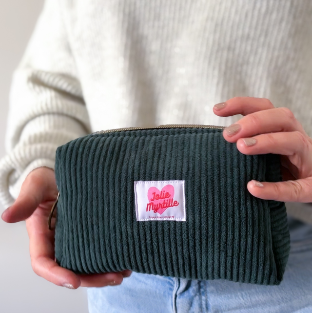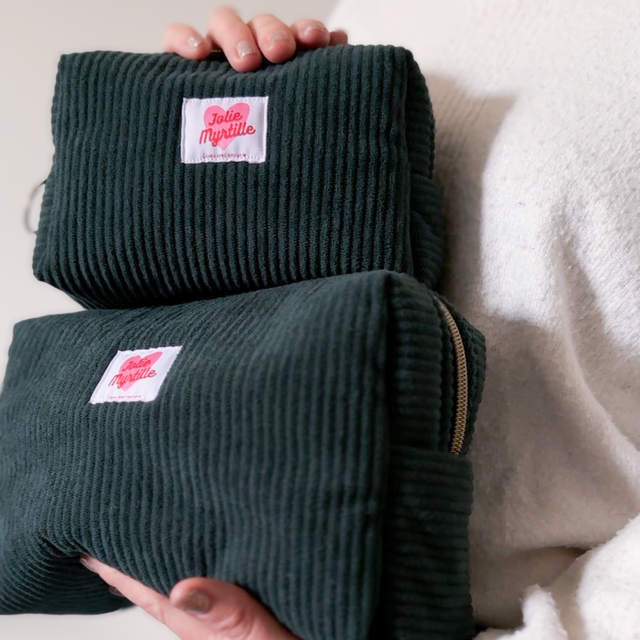 Ysée, c'est la trousse chic avec son velours vert forêt. Une teinte profonde et élégante qui va avec tout. Sa doublure fleuri orange et vert en coton vient réveiller le tout avec une bonne dose de peps !